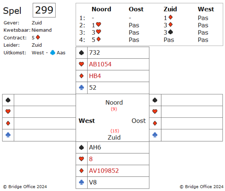 Nu zuid 2 ruiten biedt, vertelt hij dat hij geen 4 kaart harten heeft.