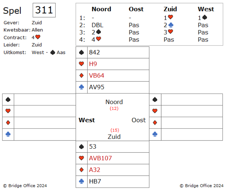 Oost neemt met ruiten boer en speelt dan klaveren.