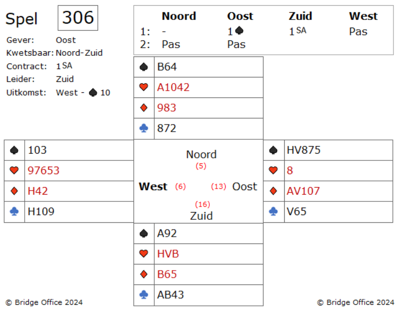Maar zou u op schoppen 10 niet de boer bijspelen, dan krijgt u maar 1 schoppen slag en gaat u vermoedelijk down.