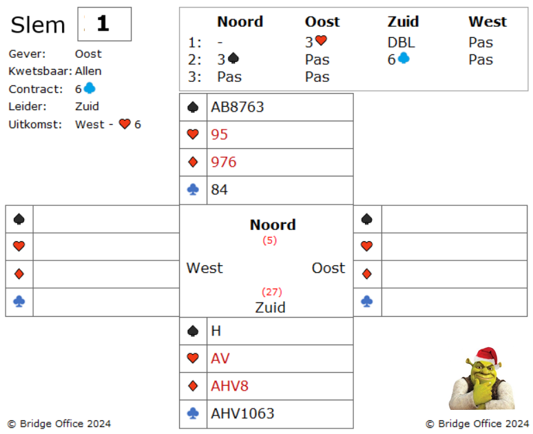 Nu begint zuid de troeven te trekken en als dat lukt dan maakt hij misschien zelfs 7 klaveren.
